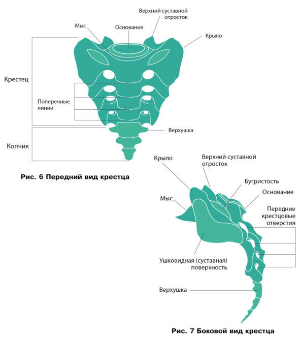 с подвздошными костями таза. У мужчин крестец длиннее и более изогнут. Между крестцом и последним поясничным позвонком есть пояснично-крестцовый сустав. Между крестцом и копчиком крестцово-копчиковый сустав (оба сустава произошли из межпозвонковых дисков в связи с прямохождением).
