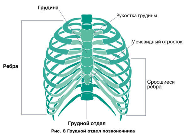 Каждый грудной позвонок сочленяется со «своим» ребром. Ребра (их 12) образуют грудную клетку, другим своим концом закрепляются на грудину. Верхние 7 пар истинные ребра; ложные: 8, 9, 10-е ребро присоединяются к хрящу, который и закрепляется на грудину, 11, 12-е ребра колеблющиеся, укороченные и имеют свободный конец. Каждое ребро имеет головку, шейку и тело. Ребра относятся к плоским костям. К первому ребру крепится передняя лестничная мышца, ко второму передняя зубчатая мышца. Массаж в местах креплений помогает снимать боли в шее. Ребра сочленяются своими головками с поперечными отростками позвонков, образуя реберно-позвоночные суставы. Эти суставы цилиндрические и участвуют в акте дыхания. Хрящевая часть тел ребер крепится на грудину (плоская кость) и образуют грудино-реберные суставы. У каждого ребра в нижней его части имеется костная канавка, в которой залегает межреберный нерв и сосуды (поэтому пациент, страдающий межреберной невралгией, не переносит интенсивный массаж в области ребер, грудной клетки, и массажист проводит манипуляции по коже, мягким тканям, стараясь не касаться ребер).