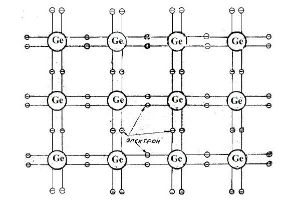 2.1-расмда атомларининг ташқи орбитасида тўрттадан электрони бўлган тоза германийнинг ясси эквивалент панжараси келтирилган. Электрон турғун холатда бўлиши учун, қўшни тўртта атом билан ковалент яъни қўш боғланади хамда валент электронлар бу боғланишда иштирок этади.
