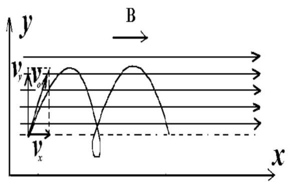 Магнит майдонига ихтиёрий бурчак остида кираётган электроннинг харакатини кўрайлик. Электронниг бошланғич тезлик вектори ва Х ўқи билан В вектор мос келган координата юзасини танлаб олайлик. V0 ни иккита, яъни VX ва Vу ташкил этувчиларга ажратайлик. VX характаланувчи электроннинг йўналиши магнит куч чизиқлари йўналиши билан бир хил бўлганлиги учун унга магнит майдон таъсир қилмайди. Агар электрон фақат шу тезликка эга бўлганда, у тўғри чизиқли текис харакат қилар эди.