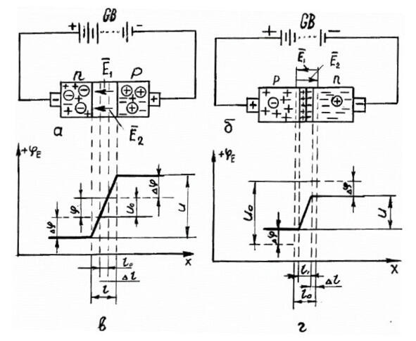 2.7 расм. Яримўтказгичлардаги тўғри ва тескари йўналишларнинг хосил бўлиши: а тескари йўналиш, б потенциаллар фарқининг n-р-зона кенгайгандаги ўзгариш таксимоти в тўғри йўналиш, г контакт потенциаллар фарқининг n-р зона торайгандаги ўзгариш таксимоти.