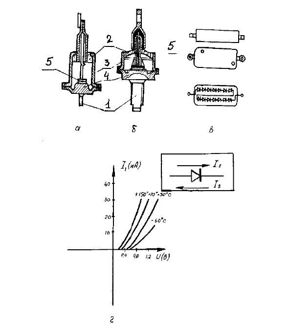 2.11 расм. Тўғрилагич диодлар ва устунчалар: а кавшарланган кам қувватли кремнийли диод: 1 чиқиқ, 2 шиша изолятор, 3 корпус, 4 кристалл тутқич, 5 алюминий сим, 6- кристалл, 7- кавшар; б қувватли тўғрилагич диоди: 1 чиқиқлар, 5 ковшар, 6 кристалл тутқич; в тўғрилагич. устунча, г-кремний ясси тўғрилагич диодларининг иш харароти бўйича ВАТси.