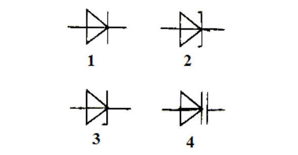 2.10 расм. Ярим ўтказгич диодларининг схемадаги шартли белгиланиши. 1 диод, 2 туннелли диоди, 3 стабилитрон, 4 варикап.