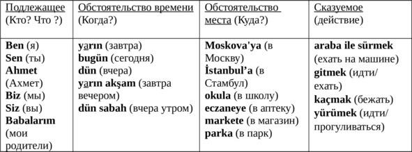 Составьте произвольные простые предложения из слов данных в таблицах в последовательно во всех временах турецкого языка, прорабатывая последовательно каждую группу времён, начиная с группы 1 (будущие времена).