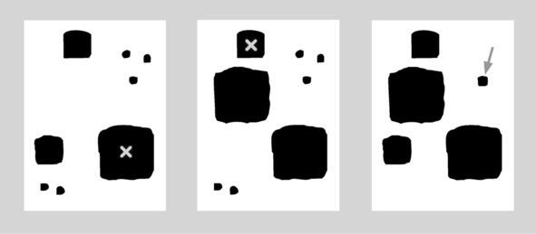 а). Контраст размера. Попробуем выделить какое-то пятно в композиции по признаку размера. Чтобы выделить пятно в качестве композиционного центра достаточно будет оставить его единственным в своем разряде. Например, на плоскости присутствуют по несколько пятен каждого размера большие, средние и малые. Если убрать все большие пятна кроме одного, это пятно сразу начинает привлекать внимание, выделяться. То же самое можно проделать со средними или с малыми пятнами.