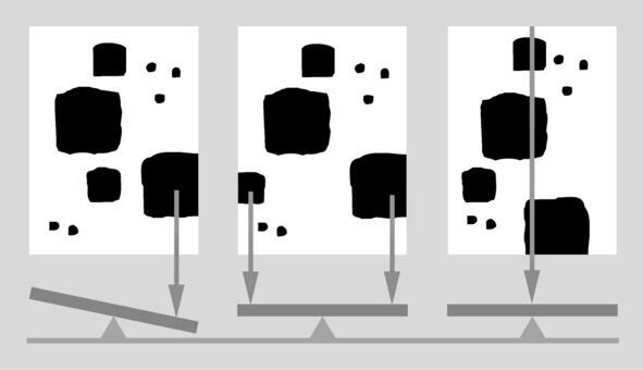 б). Инверсия или контраст цвета (выделение на нюансе). Можно выделить пятно в качестве композиционного центра, не убирая подобные ему. Возьмем плоскость, на которой присутствуют по несколько пятен каждого размера. Если на одно из больших черных пятен мы поместим маленькое белое пятно, большое черное пятно начнет выделяться среди подобных ему, на нем есть акцент, которого нет на других пятнах. В то же время, маленькое белое пятно тоже будет выделено среди маленьких пятен только оно одно белое. Возникает вопрос: что же является композиционным центром большое черное пятно или маленькое белое пятно на нем? Композиционный центр не является пятном. Это точка, некий центр равновесия в пятне, как если бы мы прикололи это пятно булавкой к вертикальной плоскости. В данном случае мы имеем два пятна и композиционный центр находится где-то на линии, соединяющей их центры. Эту схему с булавками для обозначения композиционного центра мы будем использовать далее, так как она дает некоторую наглядность.