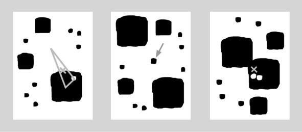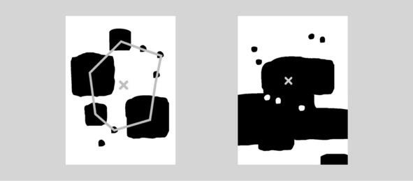 Пример справа построен на двойственности. С одной стороны, есть уникальное большое двойное пятно, с другой стороны, композиционный центр выделяется двумя маленькими белыми пятнами. Которое из этих маленьких пятен должно быть центром интереса? Ни то, ни другое. Они работают как одно целое, потому что разрыв между ними меньше, чем их собственный размер. В примере слева большое черное пятно с небольшим белым на нем и выделенной частью фона могут работать вместе, потому что они находятся очень близко друг к другу. Таким образом, если элементы расположены близко друг к другу, они могут работать как одно целое.