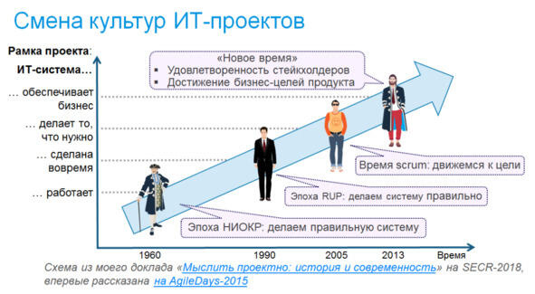 Эпоха RUP классическое управление проектами. По мере развития отрасли возрастала потребность не просто разрабатывать программы, а делать это с предсказуемыми сроками и затратами, в соответствии с планами. Это пробовали делать методами классического менеджмента, и на этом пути были многочисленные неудачи, а успех так и не был достигнут. И в принципе в 1980-х уже поняли причину: ключевым фактором успеха IT-проектов являются не процессы, а человеческий фактор. Но плохие новости редко принимают и в 1990-е годы был предпринят значительный рывок в этом направлении были собраны реальные гуру IT и создан Rational Unify Process (RUP), из которого позднее в значительной мере вырос современное проектное управление с его руководством PMBOK (Project Management Body of Knowledge). Но успеха достигнуто не было, предсказуемого результата получить не удалось, несмотря на многократно возросшую стоимость тяжелой процедуры.