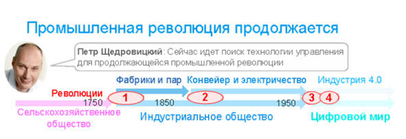 Об истории промышленных революций сопоставлении их между собой, выявлении общей логики развития и формированием на их основе картины будущего много и интересно рассказывает Петр Щедровицкий. У него есть супер-короткий 12-минутный доклад об этом, и много развернутых выступлений на его сайте https://shchedrovitskiy.com/lekcii/, включая подробный разбор пути России. И тех, кому эта тема интересна, я рекомендую смотреть и разбираться.