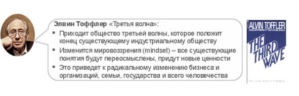 Главное изменение, которое несет промышленная революция конец индустриального общества. И это изменение тоже давно предсказано. Почти 40 лет назад, в далеком 1980 году, Элвин Тоффлер в книге «Третья волна» писал о неизбежности принципиальных изменений, показывая, что сложившиеся механизмы и мировоззрение индустриального общества будут несовместимы с тем новым, что несут технологии. И делал вывод о кардинальных изменениях, переосмыслении понятий и ценностей, которые приведут к радикальному изменению бизнеса и организаций, семьи, государства и всего человечества.