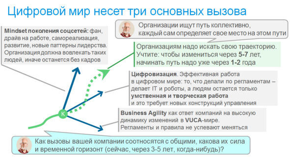 На данный момент можно заключить, что приход цифрового мира несет три основных вызова, которые обесценивают регулярный менеджмент, основанный на регламентах и компетентности сотрудников и требуют принципиально иных способов организации.