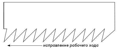 Пила, предназначенная для распиловки дерева вдоль волокон, имеет остроугольный профиль зубьев, которые расположены под острым углом по отношению к полотну ножовки. Передняя кромка зуба заострена, она скалывает стружку при таком направлении распиливания (рис. 6).
