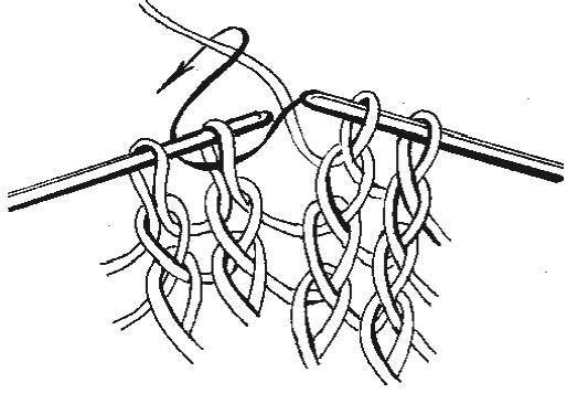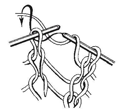 Для того, чтобы прибавленные петли не оставляли отверстий в следующем ряду, этот накид следует провязывать лицевой скрещенной или изнаночной скрещенной петлей (рис. 6).