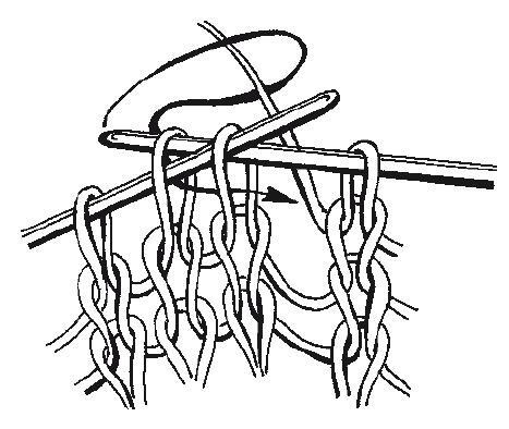 Введите правую спицу в петлю на левой спице в направлении от себя слева направо, захватите рабочую нить, вытяните петлю на лицевую сторону вязаного полотна. Новую петлю оставьте на правой спице, а провязанную петлю предыдущего ряда сбросьте с левой спицы (рис. 3).