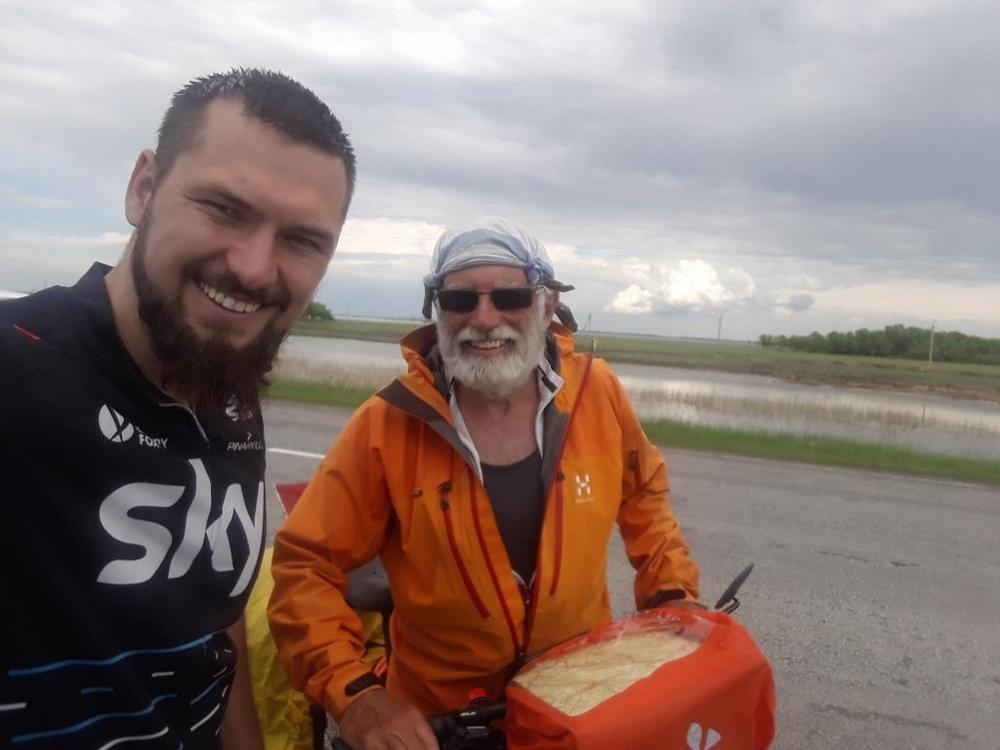 Дело было в казахстанской степи. Почти сразу после пересечения границы. Он ехал мне навстречу. На жестах и моём скудном английском нам удалось побеседовать. Зовут его Урс, ему около 50 лет, едет из Швейцарии во Владивосток! Пытался объяснить ему про свой маршрут, он в ответ только заулыбался и начал что-то лепетать на инопланетянском. Что было интересно, так это то, что у нас оказались одинаковые сёдла и покрышки.Только его седло уже отпахало 5 тысяч и выглядело так, как будто может дать мудрый совет. Моё же седло было совсем новое, даже поблёскивало на солнце. В общем, седла фирмы Brooks популярны среди путешественников во всём мире. В отличие от меня, Урс был замурован во всё водонепроницаемое. Куртка, штаны, бахилы, чехлы на сумках. А я стоял перед ним в одних велошортах, потом для приличия надел ещё футболку. Все-таки иностранцам наши дожди и ветра не по нраву. Для нас это нормально, а они страдают. Очень многое хотелось спросить у него и узнать, но на английском я знал всего пару слов. Поэтому пришлось распрощаться, сделав перед этим совместное фото.