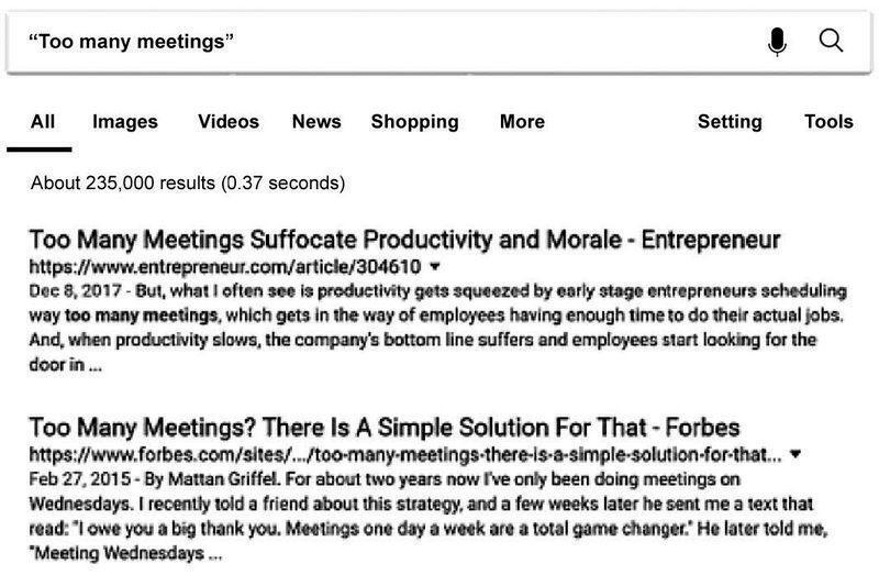 Джо Почти-Каждый, сотрудник Почти Любой КомпанииКогда мне случается рассказать кому-нибудь, что я занимаюсь исследованием совещаний, как правило, на меня обрушивается целый поток слез и жалоб. К примеру, такого рода: 1) «Я только и делаю, что сижу на совещаниях»; 2) «Если вы хотите больше знать о бесполезных совещаниях, просто проследите за моим рабочим днем»; 3) «У нас даже совещания о совещаниях есть»; 4) «Вам нужно обязательно познакомиться с организацией, в которой я работаю вот уж где образец бесполезных совещаний». Схожие настроения стали в последнее время появляться и в заголовках многих СМИ. Возьмем, например, недавнюю статью в Harvard Business Review, озаглавленную «Остановите безумие совещаний». Больше того, я из любопытства загуглил словосочетание «too many meetings» («слишком много совещаний»), и поисковик тут же выдал более 200 тысяч результатов.