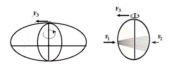F1 сила, действующая на солнечную ось из области с высокой степенью сжатия силовых нитей пространства, F2 сила, действующая на солнечную ось из области с низкой степенью сжатия силовых нитей пространства, F3 сила, определяющая направление вращения Солнца