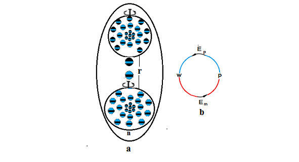 Затем протоны объединяются с нейтронами и образуют дейтроны. При увеличении степени сжатия силовых нитей пространства, равной двух кратной степени их сжатия в атоме водорода, протон и нейтрон объединяются в дейтрон. Предполагается, что происходит следующим образом. С ростом степени сжатия силовых нитей пространства, то есть гравитационного сжатия, увеличивается кинетическая энергия нуклонов и они начинают сближаться. При достижении критического расстояния между ними (Рис 4. a) они обмениваются квантами энергии материи, так называемыми глюонам. Глюоны образуются в результате движения простонов и гравитонов, составляющих нуклоны при их движении в силовых нитях пространства. Затем энергия материи переходит в энергию пространства (Рис.4.b).которая связывает нуклоны и образуется дейтрон (ядро дейтерия). Энергия связи дейтрона составляет 0,1% от его массы покоя. Но образование дейтрона происходит, если обе частицы, имеют одинаковый спин. При разных спинах протон с нейтроном не объединяются. Таким образом, в результате последовательно идущих термоядерных реакциях четыре протона превращаются в ядро гелия. При этом образуются два позитрона, два нейтрино и выделяется энергия (Q = 26,73), а энергия связи гелия возрастает до 0,74% от его массы покоя