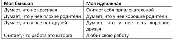 2. Во второй столбик под названием «Моя идеальная» напротив каждой мысли напиши, как бы ты хотел, чтобы эта мысль звучала, но только в отношении твоей будущей женщины. Например, если ты написал: «Мать моей бывшей говорила ей, что все мужчины изменяют», значит, во втором столбике напротив «мать моей бывшей говорила ей, что все мужчины изменяют» пиши: «Мать моей идеальной говорила ей, что есть верные мужчины».