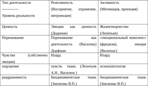 Таблица заполнена нами не в полной мере, но она охватывает практически все теории эмоций и представляет собой некую «структуру знания». Что касается классически выделяемых чувств в дифференциальной теории эмоций, то нужно сказать, что практически все чувства могут преживаться по обоим типам и по всем пяти уровням. Однако, у каждого чувства есть сложившийся и культивируемый тип переживания. Так для чувства юмора стандартен тип реактивности, восприятия (отражения) на уровне собственно эмоций. Для ностальгии, проанализированной А. Н. Фенько (Фенько, 1993), уровень переживания и тип производства, для горя, проанализированного Ф. Е. Василюком (Василюк, 1988) тип восприятия и уровень переживания. Любовь может осуществляться на всех уровнях по обоим типам, но на наш взгляд в современности ей характерен уровень активной ценности. Гнев переживается как производная, мотивационная эмоция на уровне ощущения. Посредством логического анализа теории и эмпирии эмоций возможно полнее заполнить вышеприведенную таблицу, и она представляла бы уже не систему знания о юморе, а систему экзистенции эмоций.