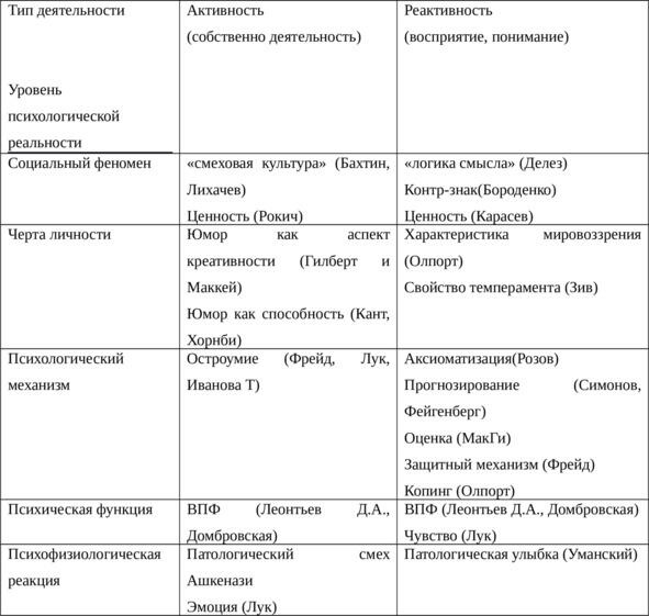 Хотя не все ячейки нашей двумерной логической схемы заполнены с должной полнотой (в них представлены только основные достижения обозначенных подходов), практически все известные нам достижения в области психологии юмора «укладываются», «пакуются» в эту схему. То есть предлагаемую нами логическую схему можно использовать для различения предмета исследования по типу деятельности и уровню психологической реальности, а также и для структурирования знаний о юморе. Более того, мы полагаем, что логический анализ юмора по критерию уровня психологической реальности снимает проблему противостояния объекта и субъекта в жизненном мире человека, снимает проблему противопоставления эмоционального и интеллектуального, а выделение типов деятельности производство, активность и восприятие, реактивность заостряет важную для психологии проблему соотношения продуктивной деятельности и деятельности понимания. Проблему же ресурса реактивности и понимания мы считаем более актуальной для современности, чем проблему потенциала продуктивности и самовыражения. В конечном счете, даже творческая продуктивность зависит от ресурса реактивности, рецептивности и понимания.