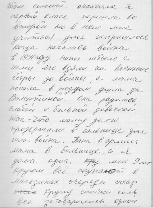 Это были самые лучшие годы моей жизни. Мама работала на «Красной заре» намотчицей, а я была предназначена сама себе, делала, что хотела, садиков не было, и я с другими детьми гуляла во дворе. Я озорная девочка, и меня не все любили, а мальчишки побаивались, я могла их и поколотить. Но это всё было детство чудное детство. В 1940 году я пошла в школу, номер я её не помню, но это на Нейшлотском, большое серое здание, оно и сейчас там стоит. Окончила я первый класс, перешла во второй, но в нем мне учиться уже не пришлось. Когда началась война в 1941 году, папы не было с нами, его взяли на военные сборы до войны, а мама попала в роддом, ушла за Валентиной (Валентиной Николаевной Абрамовой, в девичестве Дегтярёвой). Она родилась слабой и больной девочкой, так что маму долго продержали в больнице, уже шла война. Папа в армии, мама в больнице, а я дома одна. Мне 9 лет, кругом все скупают в магазинах очереди сахар, крупу, спички, соль, все затоварились. Одной мне ничего не надо. Гуляю себе сколько хочу.
