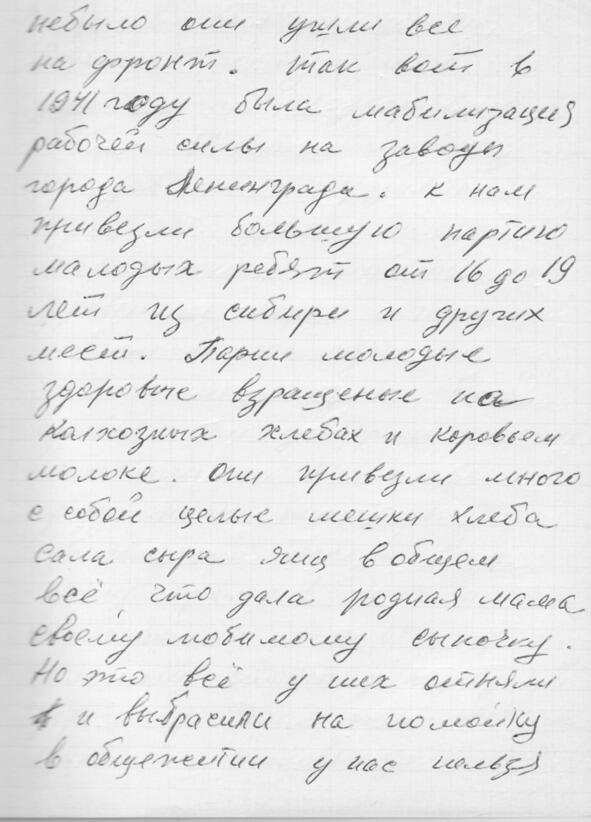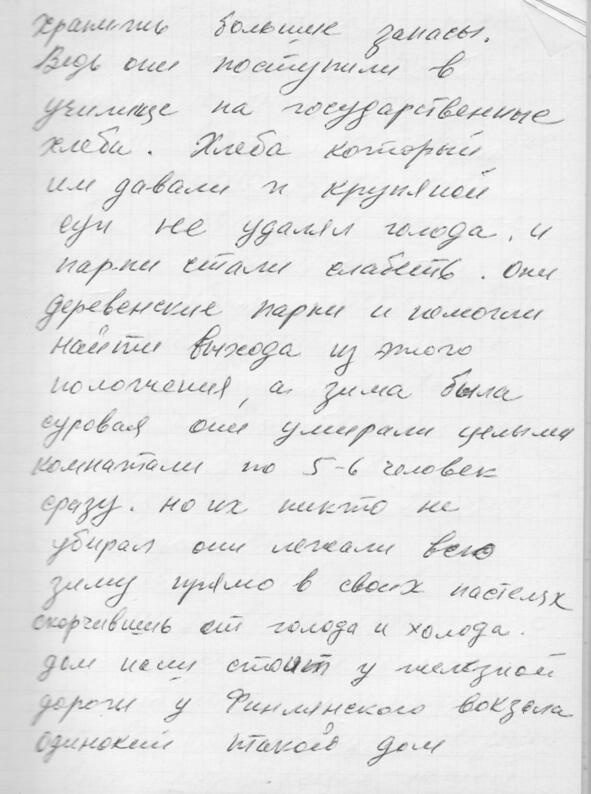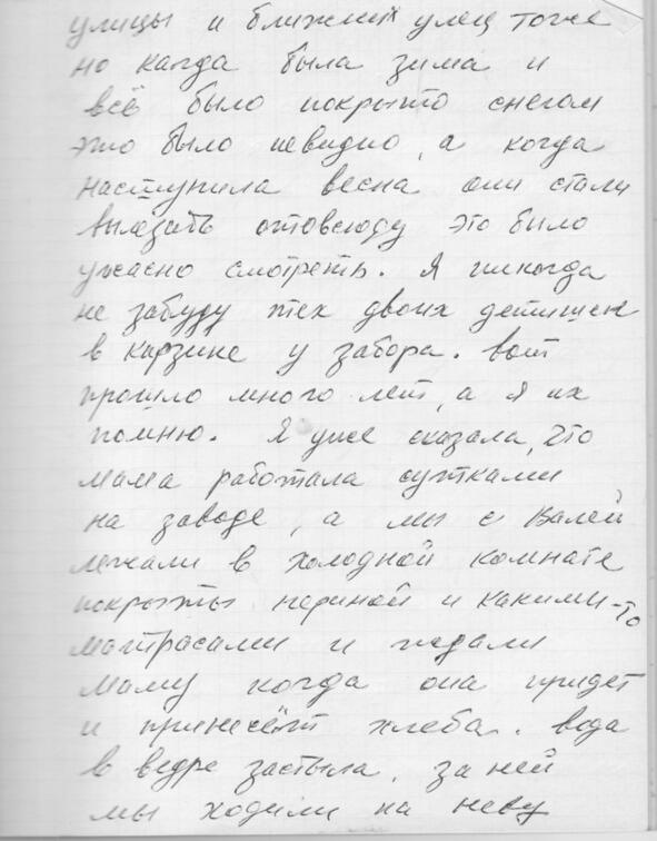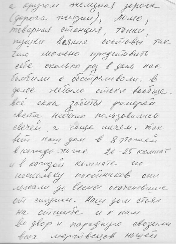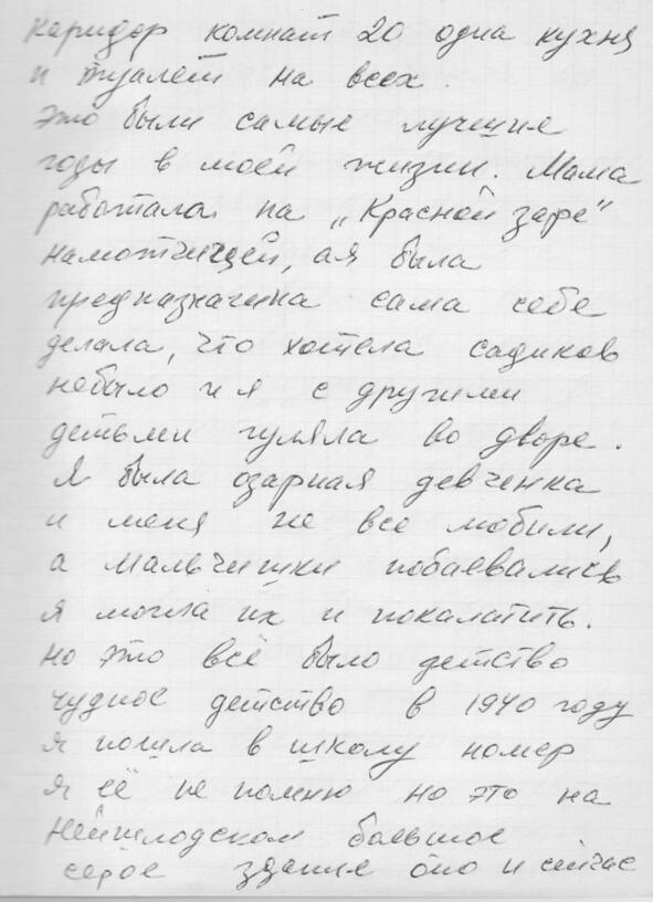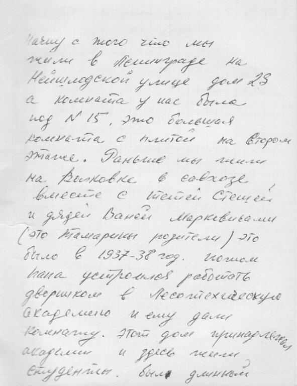 Начну с того, что мы жили в Ленинграде на Нейшлотской улице, дом 23, а комната у нас была 15. Это большая комната с плитой на втором этаже. Раньше мы жили на Волковке в совхозе вместе с тётей Стешей и дядей Ваней Маркевичами (это Тамарины родители (Тамары Ивановны Василевской, в девичестве Маркевич)). Это было в 19371938 годах. Потом папа устроился работать дворником в Лесотехническую академию, и ему дали комнату. Этот дом принадлежал Академии, и здесь жили студенты. Был длинный коридор комнат 20, одна кухня и туалет на всех.