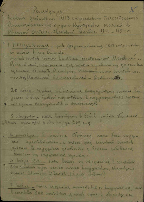 Календарь боевых действий 1018 сп 269 сд с 16.07 по 7.11.1941г.