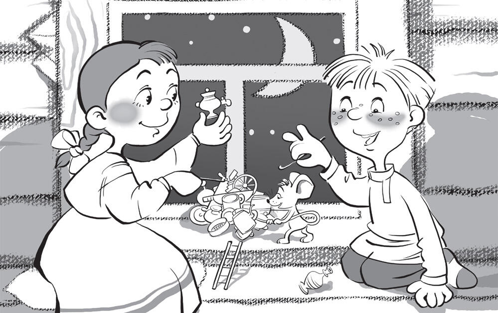 Зимой в деревне скучно. Смеркается[6] рано, дома до самых окошек снегом завалены. В избе горит лучина[7], и взрослые занимаются разными делами: папа чинит лошадиную сбрую[8], мама и старшая сестра шьют и вышивают, дедушка вытачивает деревянную домашнюю утварь[9]. Младшенькие Маша и Ваня забрались на теплую печку и слушают бабушкину сказку про Ивана царевича и Серого Волка, про Кощея Бессмертного и Василису Прекрасную. Но скоро старенькую бабушку сморил сон, она задремала.