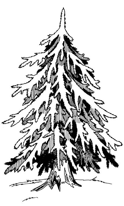 В зимнем лесу ели стоят, опустив почти до земли густые колючие ветви, укрытые белой снежной шалью. Зимой в густом еловом лесу теплей, чем в любом другом. Все дело в том, что сюда не проникает ветер. Высоченные деревья как мощный заслон встают на пути даже самого свирепого урагана.