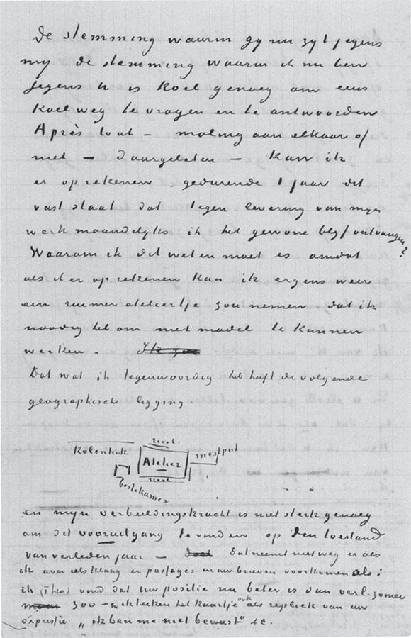 Это не отменяет того, что, если я жалуюсь на что-нибудь, в твоих письмах появляются пассажи вроде: я (Тео) считаю, что сейчас твои условия лучше, чем прошлым летом. В самом деле? И я, помимо прочего, рисую маленькую карту в ответ на твои слова «я не осознаю» и т. п., и я не принял бы этого твоего письма, если бы этого там не было.