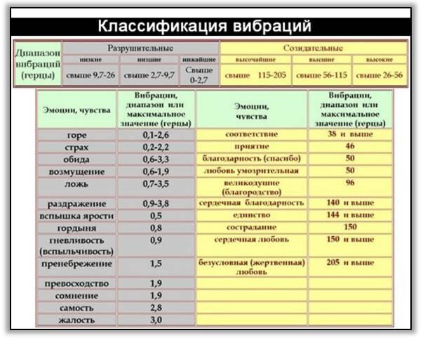 Как было ранее упомянуто, человеческое тело тоже является источником излучения разных частот и действует как передающая станция. Но частота сама по себе ничего не значит, если нет информации, которую необходимо куда-то передать. Это как радиостанция, которая передаёт либо голосовую информацию, либо музыку. В зависимости от свойства той или иной полученной информации, внутренне человек радуется или огорчается. Градация восприятия зависит от принятой информации, которая зависит не только от качества, но и от природы вибраций. В таблице ниже наглядно показана классификация вибраций, которая воздействует на сознание человека позитивно или негативно.