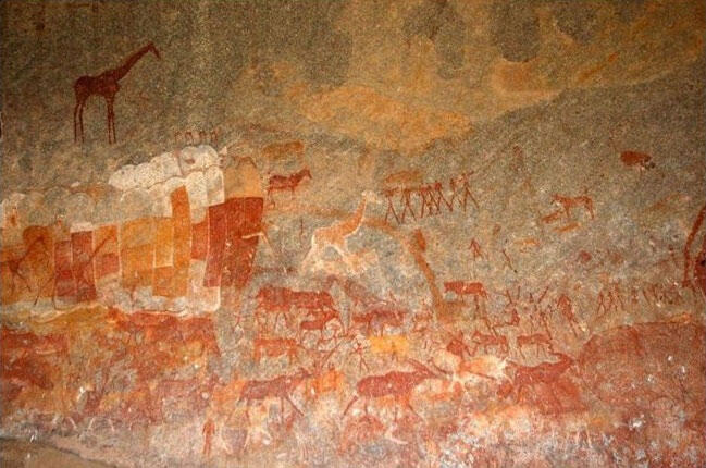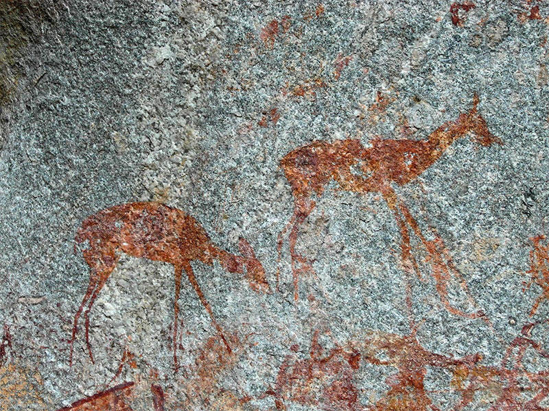 Первые поселения на землях современного Зимбабве датируются палеолитом. Археологическими находками данного периода являются главным образом каменные части орудий, реже изделия из кости. Более многочисленные находки мезолита и неолита орудия труда, оружие, посуда[2]. Около 60005000 лет до н. э. населяющую эту территорию племена, вытеснили бушмены, оставившие после себя наскальную живопись, повествующую о нелегкой жизни охотников-собирателей. Некоторые из лучших рисунков находятся в пещерах Матопо Хиллс к юго-востоку от Булавайо, самые известные из них пещеры Бамбата, Нсватуги, Инанке и Силозване[3].