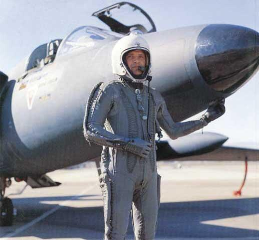 Ф. Г. Пауэрс в высотно-компенсирующем костюме и гермошлеме на фоне самолета U-2
