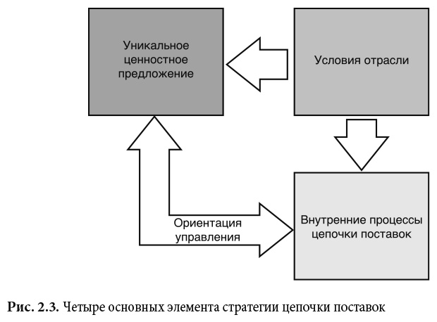 В результате Перез излагает, каким образом на стратегию цепочки поставок влияют взаимосвязи между четырьмя основными элементами (см. рис. 2.3).