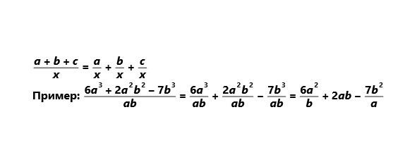 Частное от деления многочлена на одночлен равно сумме частных, полученных от деления каждого слагаемого многочлена на одночлен.