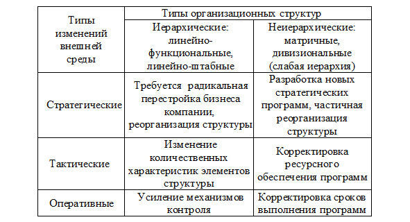 Характер влияния трех типов изменения внешней среды на организационную структуру компании показан в рис. 2.4.1.