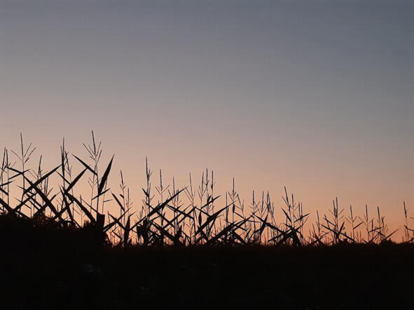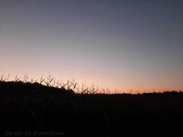 На фото ранний рассвет. И нечто, очень похожее на кукурузу, но это не она. Это = сорго. Как кукуруза, только без початков. А настоящая кукуруза на соседнем поле.