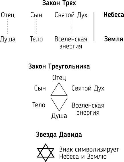Этот Закон Трех был отсылкой к теории реинкарнации. Ранние христианские отцы, более просвещенные, соединили Святую Троицу индуизма с этой доктриной из учений Иисуса, создав Святую Троицу, которую теперь признает христианство[1]. Отец, Сын и Святой Дух отсылают к душе, телу и Вселенской энергии или жизненной силе.