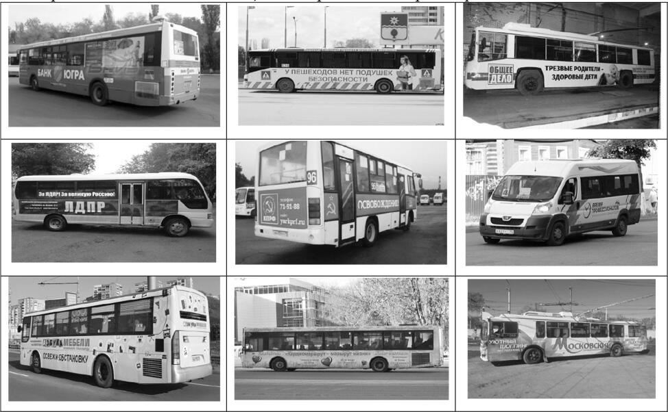 Для проведения исследования было отобрано несколько фотографий коммерческой, политической и социальной рекламы, размещаемой на транспорте (автобусы, микроавтобусы, троллейбусы).