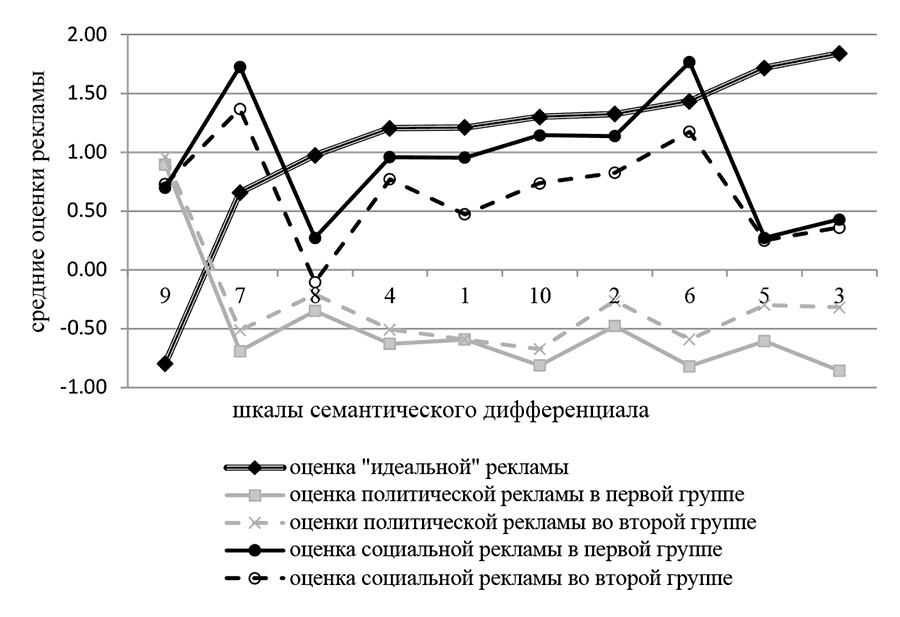 Как следует из графика, в целом социальная и политическая реклама оцениваются всеми респондентами ниже, чем «идеальная» по большинству шкал СД. По шкалам «расслабляющая напрягающая» и «безразличная заботливая» социальная реклама оценивается выше, чем «идеальная», то есть как «заботливая» и «напрягающая».
