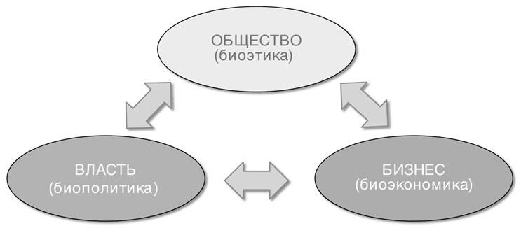 При попытке объяснить механизмы, регулирующие социальные взаимоотношения в нынешнем мире, мы неизменно попадаем в триединство «общество власть бизнес», которое во многом предопределяет все многообразие деятельности современного постиндустриального социума. Нам представляется, что указанные три элемента имеют соответствующие эквиваленты, появившиеся в результате ускоренного всеохватного развития биотехнологии и наук о жизни в наступившем столетии. Термину «бизнес» соответствует биоэкономика, термину «власть» биополитика, термину «общества» биоэтика (рисунок 1).