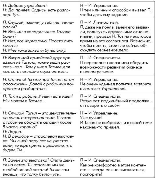 Смена одного контекста другим может происходить несколько раз даже в процессе одного разговора. Инициатором этого может выступать любой из участников. Очень типичная картина: начальник начинает с описания поручения, потом переключается на обсуждение какой-то ситуации, по случаю рассказывает анекдот, затем решает поучить подчиненного, и, вернувшись в контекст Управления, загружает ответственностью за результат. Что там в голове подчинённого после таких скачков неизвестно.