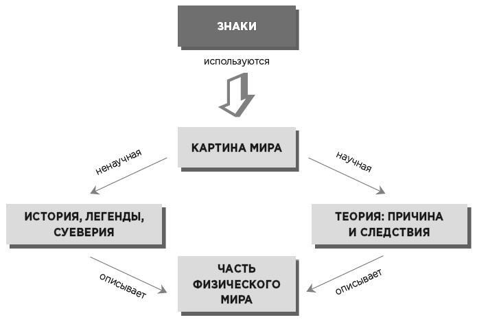 Описания физического мира можно разделить на две категории: научные (теории, дисциплины) и ненаучные (истории, легенды, суеверия, мифы). Отличия между ними в том, что теории дают объяснение действительности, которое выдерживает проверку научным методом. Теория одинаково формулируется или передает одну и ту же суть на разных языках. Ненаучные теории, в свою очередь, не имеют строгих форм, но хорошо справляются с другой задачей устранением внутреннего беспокойства и тревог.