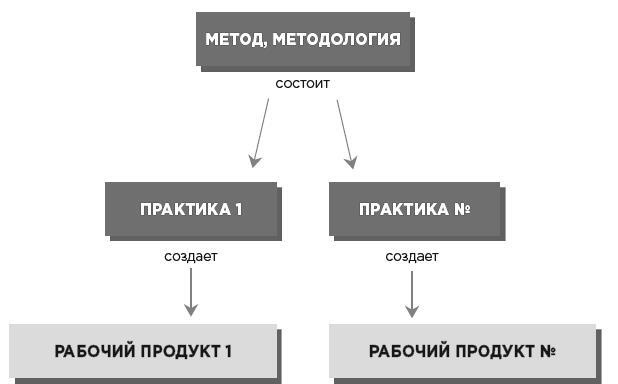 Мы не будем разделять понятия «метод» и «методология». Методология/метод это совокупность определенных практик, которые необходимо выполнить, чтобы сделать сложную работу и получить готовый продукт. Например, метод создания прически включает практики мойки головы, стрижки, сушки, укладки, а метод сборки автомобиля это совокупность практик сварки, крепления деталей и т. д.