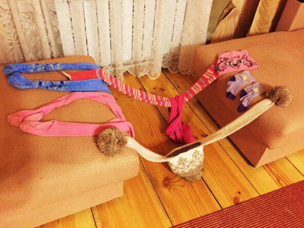 «С помощью растянутых шарфа и шапки автор явно хотел показать, соединение прошлого и будущего в настоящем моменте. Морда кота это единство с природой, а повернутые в одну сторону носки поиски душевного покоя. Что означают розовые и синие колготки, даже для экспертов культуры осталось загадкой».