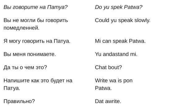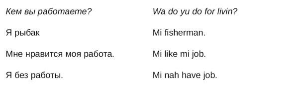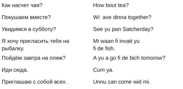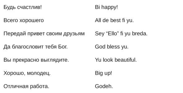 Jamaican Patwa произошел от английского, испанского, французского (и еще кучу разных языков). Не удивляйтесь знакомым английским словам. Школьные знания английского языка будут способствовать быстрому схватыванию материала.