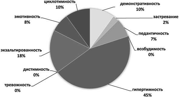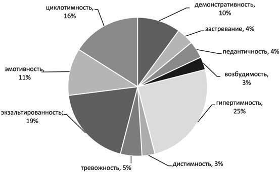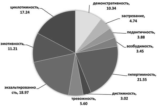 Выяснилось, что у большинства акцентуированных лиц выражена шкала гипертимности (25 %), на втором месте акценты принадлежат шкале экзальтированность (19 %) и на третьем месте выражена циклотимность характера (рисунок 1).