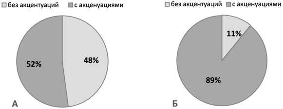 Из рисунков видно, что акцентуированных юношей незначительно больше, по сравнению с неакцентуированными (52,08 и 47,92 %, соответственно). У девушек почти 11 % студенток не имеют акцентуаций, однако подавляющее их число оказались акцентуированными личностями (89,15 %). Это в 1,7 раза больше, чем акцентуированных юношей.