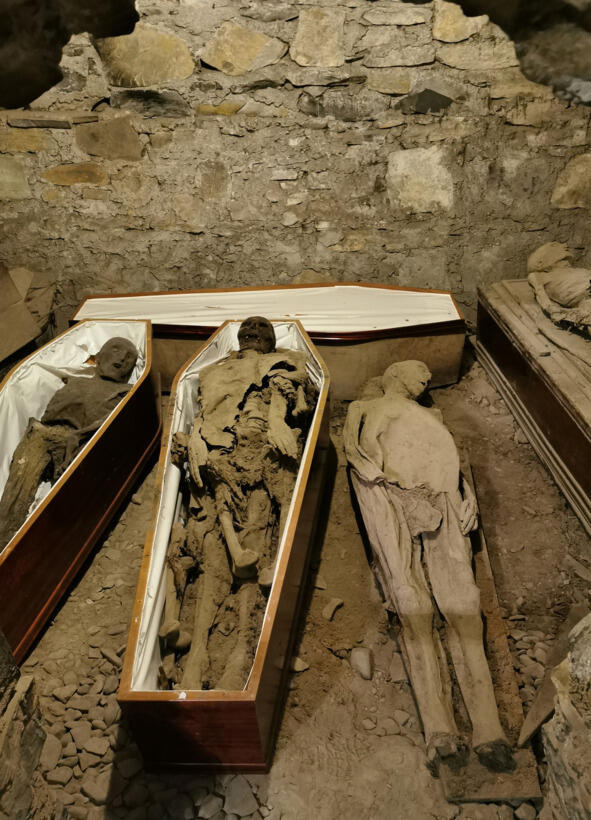Крипт несколько, но для посещения открыты только две в них вы попадаете через тяжелые металлические двери, которые с трудом открывает гид. Первая самая впечатляющая. Сухая атмосфера подземелья, поддерживаемая известковой кладкой, позволила трупам мумифицироваться. Одна из самых интересных мумий это «крестоносец». То есть, по сути, ему должно быть не менее 800 лет. Учитывая, что новое здание было построено в конце XVII века, в эту легенду верится с трудом. Только если тело не было перенесено из первоначальной церкви. Кроме того, у загадочного «крестоносца» по неизвестной причине нет ног.